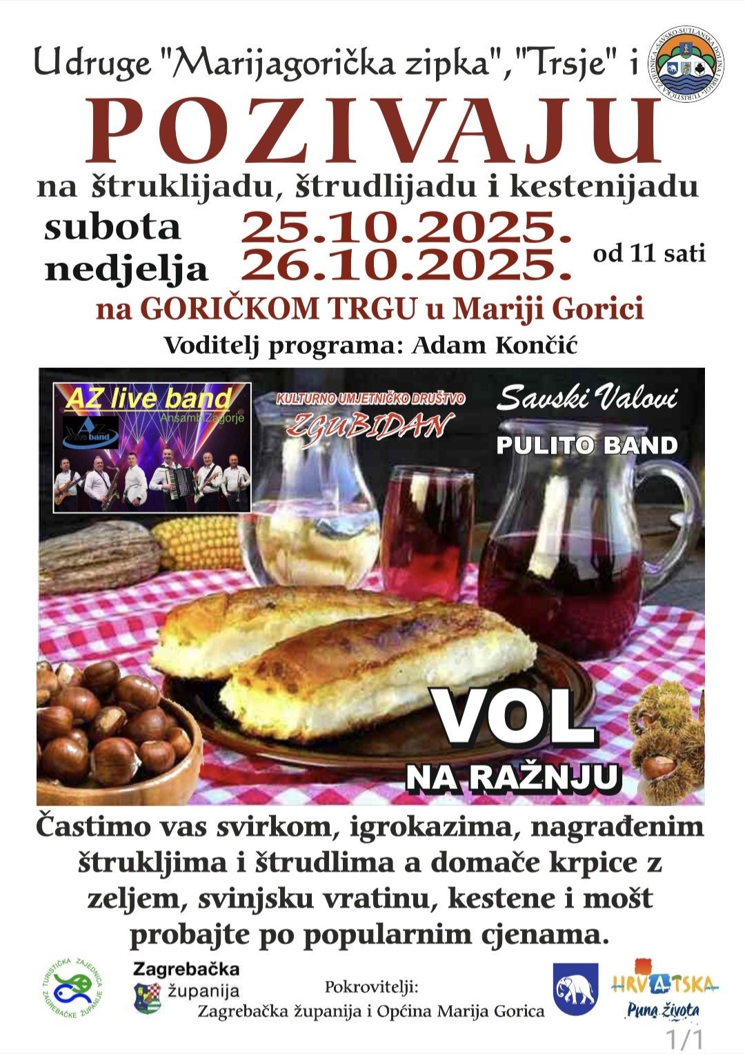 Pozivamo Vas u subotu 25. 10. i nedjelju 26. 10. na tradicionalnu manifestaciju "Štruklijada, štrudlijada i kestenijada" na Goričkom trgu u Mariji Gorici.